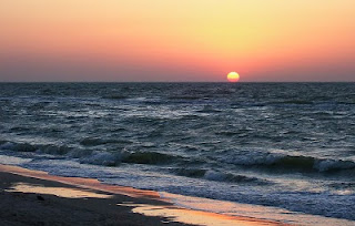 А ось знімок заходу. Горизонт ділить кадр на дві майже абсолютно рівні половинки. До того ж і сонце виявилося майже по центру кадру. Будемо різати. Земля / вода явно цікавіше неба - воно безхмарне і у верхній частині кадру майже рівного кольору. Так що підрізаємо верх і, заодно, наближаємо праву межу до сонечка: