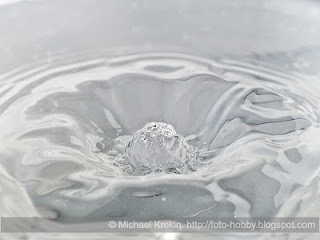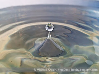 Ех, давненько я нічого не писав (Автор: Михаил К.)... Та, по правді сказати, і камеру взяти в руки було ніколи. Але ось нарешті днями утворилося у мене деяку кількість вільного часу. І вирішив я трохи «пограти» з водою ... Часу було небагато. І утворилося все якось спонтанно. Так що ні про яку особливої підготовки, спеціально підібраному обладнанні та інших зручності мови не йшло. Споруджував «установку» з того, що виявилося під руками. А виявилося під ними ось що: «Ванна», в яку краплі будуть падати. Її роль зіграла кришка упаковки болванок CD-R (тієї, в якій їх 50 штук). Глибина цілком підходяща. В іншому - штука, м'яко кажучи, не дуже підходяща. Ідеальним був би посудину з великою площею і гладким дном, плавно переходить в стінки. У моєму ж випадку довелося дуже акуратно вибирати ділянку, що потрапляє в кадр, щоб лінії від виступу на дні і стику дна зі стінками не псували весь малюнок. В якості фону під і за банкою підійшла папір для принтера формату А4. Тут маленький розмір посудини був на руку - ширини стандартного листа виявилося цілком достатньо. Джерелом «капели» став завалявся в моєму господарстві шприц. По розуму, звичайно, треба б було зафіксувати його положення за допомогою якого-небудь штатива ... Але, через брак нічого підходящого, довелося сподіватися на твердість власної руки. А ось камеру на штатив треба ставити обов'язково. Тут - без варіантів. Інакше шанс почути виразну результат мізерно малий. Природно, на фотоапараті повинен бути макрооб'єктив (або звичайний об'єктив, встановлений через макрокільця, або на звичайному об'єктиві «макрофільтр» - лінз насадок). У мене - Zuiko Digital 35mm / 3,5 Macro. І не забудьте, що об'єктиви та камери аматорських серій від бризок не захищені. Тож безпека апаратури - на совісті фотографа. Нарешті, освітлення. Ідеальним, ймовірно, було б використання дуже яскравого постійного світла (наприклад, сонячного). Щоб дозволив отснімать серії з дуже короткими (<1 / 1000 с) витягами. Чому такими короткими? - Щоб «заморозити» рух води. Прожектори будинку є не у всіх, та й сонце восени в наших широтах здебільшого приховано за хмарами. Так що доведеться скористатися спалахом. Оскільки об'єкт зйомки зовсім маленький, навіть зовсім без розсіювача світло не буде занадто жорстким. Але, щоб краще промальовувати обсяг, спалах ставимо не на башмак камери, а збоку (Мій Metz 48 AF-1 має режим дистанційного управління, але можна використовувати удліннітельний шнур або синхронізатор). Для більш рівномірного підсвічування з протилежного спалаху стороні ставимо відбивач. Ви, можливо, вже здогадалися, що це знову-таки аркуш білого паперу. Ось, власне кажучи, і вся «знімальна установка». Тепер займемося зйомкою. По-перше, перемикаємо камеру в режим ручного фокусування. Це дуже важливо. Автоматично вона, якщо і наведеться на щось, це явно буде не крапля. Фіксуємо апарат на штативі і наводимо різкість по якому-небудь контрастному предмету, вміщеної в точку очікуваного падіння краплі. Я використовував шматок дроту в чорній ізоляції. Спалах, встановлена в парі десятків сантиметрів від об'єкту зйомки, дасть дуже яскраве світло. Це дозволяє сильно закрити діафрагму (до f/8..f/11) і збільшити таким чином глибину різкості. Робимо кілька «пристрілювальних» кадрів, підбираючи потужність спалаху. Зверніть увагу: сцена у нас набагато світліше «середньо-сірого», так що 